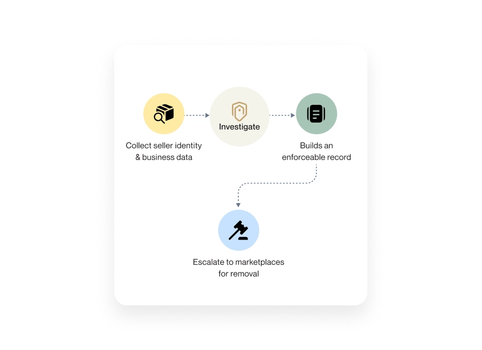 Gather enforceable evidence against persistent violators. For sellers who don’t respond to messaging, Sigil conducts targeted investigations. Our team collects seller data and builds a case that meets marketplace standards for legal enforcement, tailoring evidence to your product category and intellectual property rights.